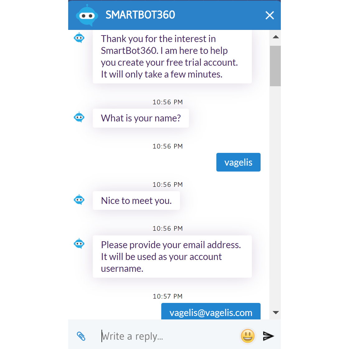 Using Trialbot, the user can start chatting with their own unique personalized chatbot in minutes. The user can then login to their SmartBot360 Management Dashboard account to further customize the looks of the flow of the bot.